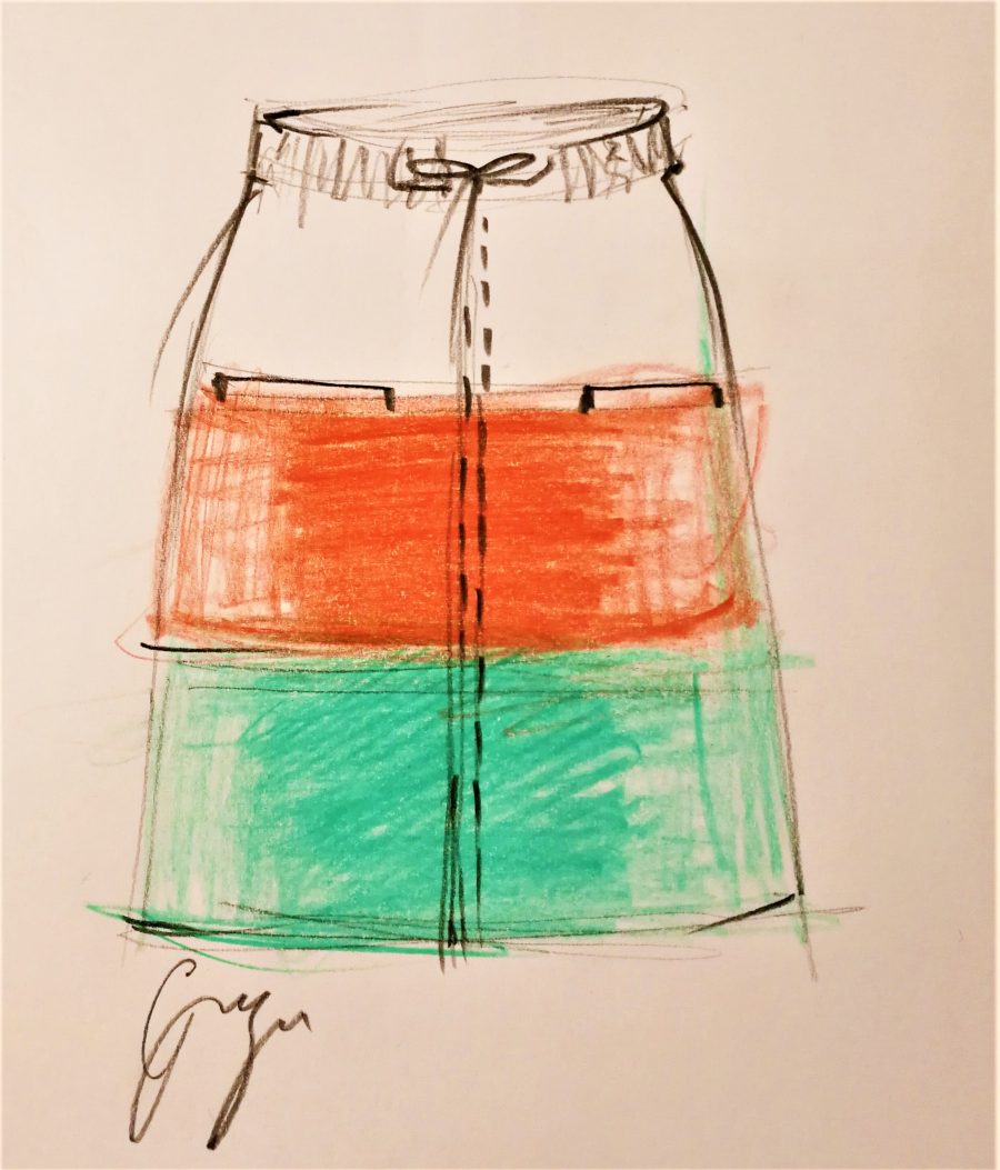 O altă piesă care a făcut carieră în garderoba mea era o fustă sport cu buzunare mascate și talia pe elastic, cu un șiret alb ce se strângea la mijloc, în trei registre orizontale de culoare, alb, orange spre roșu vermillion și turcoise. Exact în acest moment când scriu, odată cu rememorarea culorilor și texturii vin alături și mirosul pachetului despăturit cu frenezie. Avea un miros indescriptibil de parfum proaspăt, ceva nemaiîntâlnit de mine până atunci. Țin minte că era zi și soare și mirosea a Franța tot cadoul. Căci și mirosurile aveau proveniența lor aparte nu doar obiectele. Un miros din Franța sau Italia nu se compara cu mirosul de România.