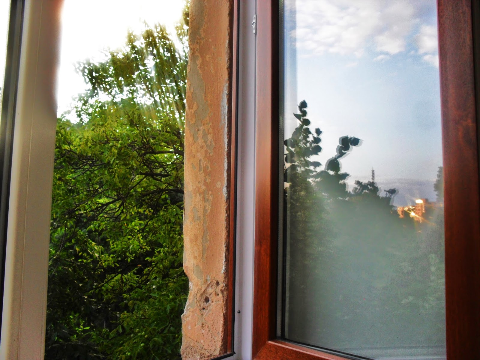 Ferestrele sunt înăuntrul lor, de cele mai multe ori închise, o pisică, un iepure, sau combinaţii bizare dintre animale, sunt prizonierele benevole ale stăpânelor sale, cu ochii, de cele mai multe ori acoperiţi. Alteori, stăpâna este prizoniera propriei sale ferestre, cum este imaginea cu marea şi cu peştii, în care luna suprarealistă este solzoasă ca un peşte, apucat de coadă, ca să nu fugă, e o chestie, deja, să ţii luna de coadă…fiecare poate interpreta aceste imagini după bunul lui plac fără nici o îngrădire a înţelesurilor, de aceea nu voi mai povesti, nici eu, prea mult pe marginea lor. Total lipsită de premeditare, în final o poză făcută de mine, zilele trecute în vreme ce admiram apusul de la fereastra şcolii unde predau, şi unde am sesizat, fără să vreau haloul superb al realităţii oglindit in sticla geamului în contrast cu viul culorilor vieţii reale. Te apucă ameţeala dacă stai să meditezi la asta pentru că, pare foarte greu de ales între ele.