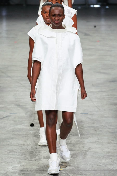 În antiteză perfectă cu imaginile strălucitoare promovate pe podiumurile de fashion, pe care calcă modelele măsura 0, Rick a ales ca protagonistele prezentării să fie membrele unor trupe de step- dance, cu proporții și înălțimi deloc grațioase. Războinicele sale apar în cadru pe ritmuri deloc dulci, cu mimica supărată înspre scârbită, iar tot ceea ce poți verbaliza din străfundurile educației tale perfect estetizante este că sunt urâte ca naiba. Dincolo de întreaga punere în scenă a show-ului, care scoate prezentarea, firesc, din anonimatul înșiruirilor pe catwalk, partea pozitivă este dată, indiscutabil de transgresarea dusă până la extrem, a categoriilor estetice cu care suntem alimentați cotidian de lumea obișnuită a modei. Rick Owens este liber și foarte altfel în acest sistem construit al modei deopotrivă cu Chalayan, Viktor&Rolf și alții asemenea. Dacă i s-ar putea imputa ceva, legat de demersul său de design, sigur aceasta nu ar face referire la veșminte. Pentru că după ce trecem de prima impresie dată de mișcările și muzica repetitiv ritualică și privim veșmintele cu atenție, nu putem spune că a mizat pe efectul de scenă pentru a ascunde lipsa creativității.