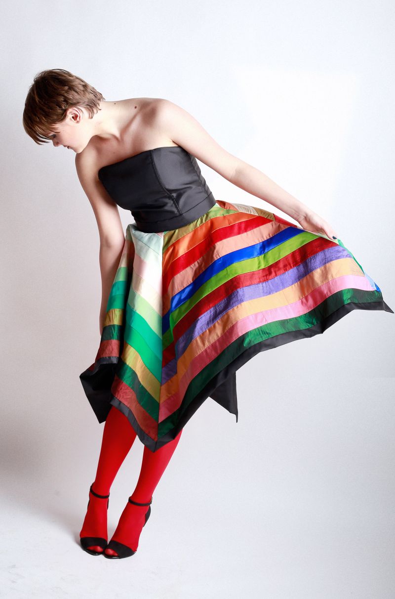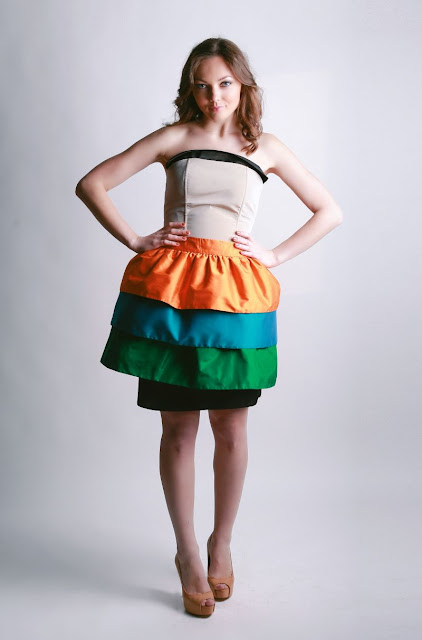 Ideea de bază a fost ca pe niște simple rochii bustieră ( foarte în trend pt sezonul primăvară- vară 2013, de data aceasta) fetele să creeze un soi de forme simple, geometrice și foarte colorate care să permită ulterior convertirea în alte și alte soluții prin plieri și drapaje ce pot schimba prima și cea mai perceptibilă identitate a veșmântului.