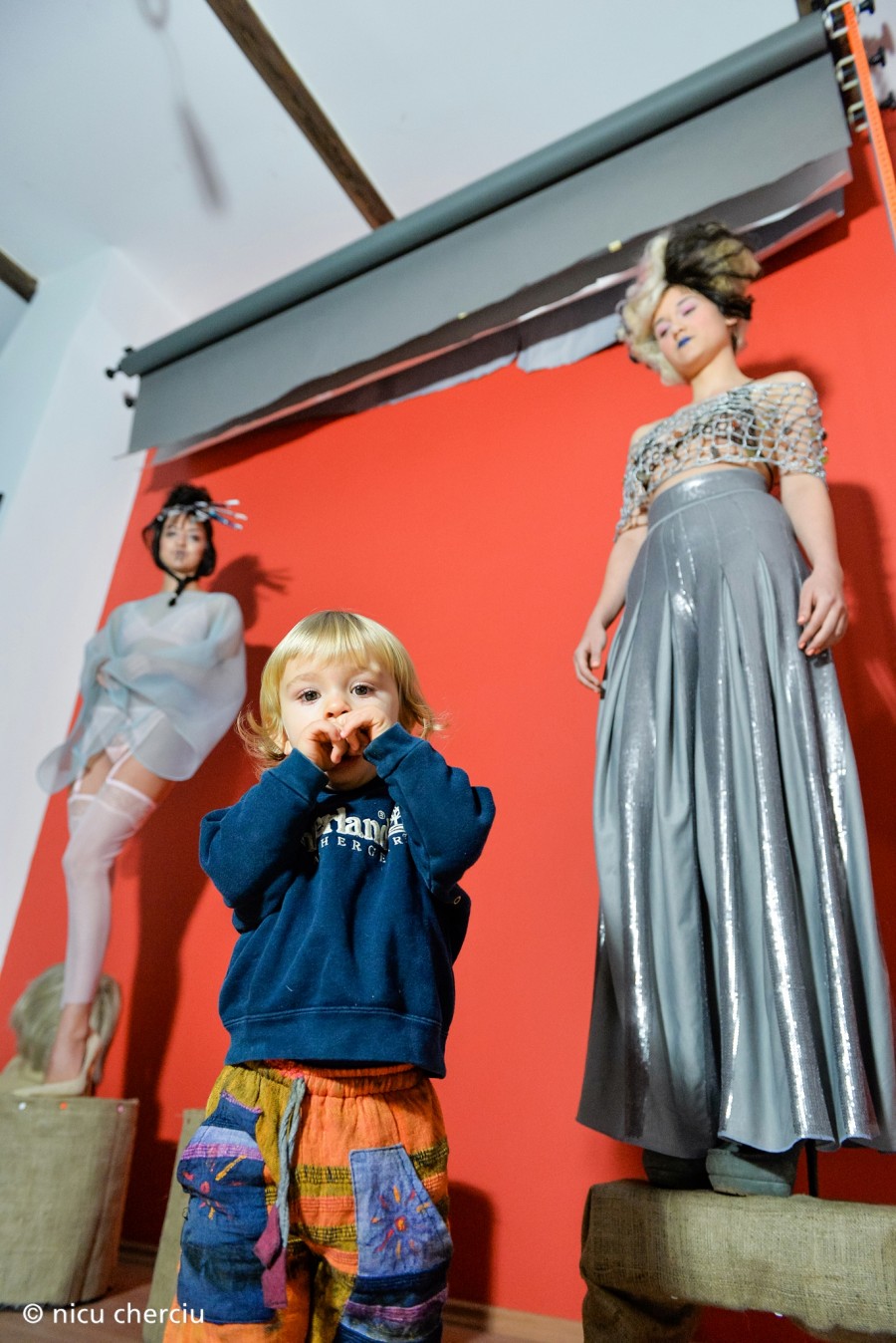 Într-o binevenită idee de-a Crinei, s-a făcut și transcenderea dinspre bidimensionalul imaginilor fotografice la tridimensionalul concret al unor modele înveșmântate în propuneri vestimentare, provocatoare și sugestive, așezate pe piedestale ca statuile în fața spectatorilor, exponate însuflețite și emotive prinse în spot-lightul reflectoarelor. Vestimentațiile au fost asigurate de subsemnata și de Glam’Or Boutique by Alex Moldovan. Hair-stylingul foarte special a fost realizat de Corina Costea de la Ego Studio iar make-up-ul asemenea, de Maria Costină Boloș