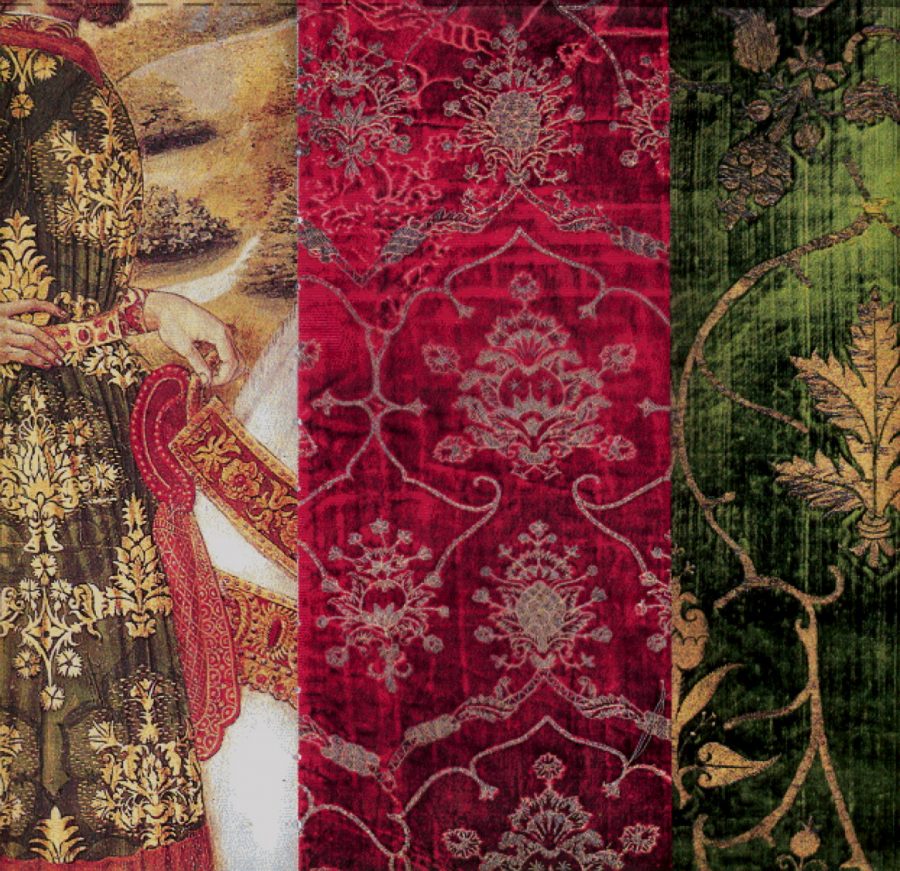 Fragmente de țesături de tip renascentist de catifea broșată, pătrunse și pe teritoriul românesc datorat schimburilor comerciale cu Veneția