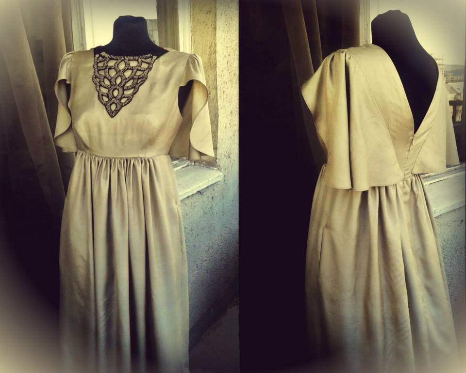 - Rochie din vîscoză cu talie empire și mîneci ample, fluide, gen pelerină, cu detaliu ornamental ready made